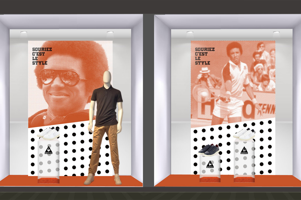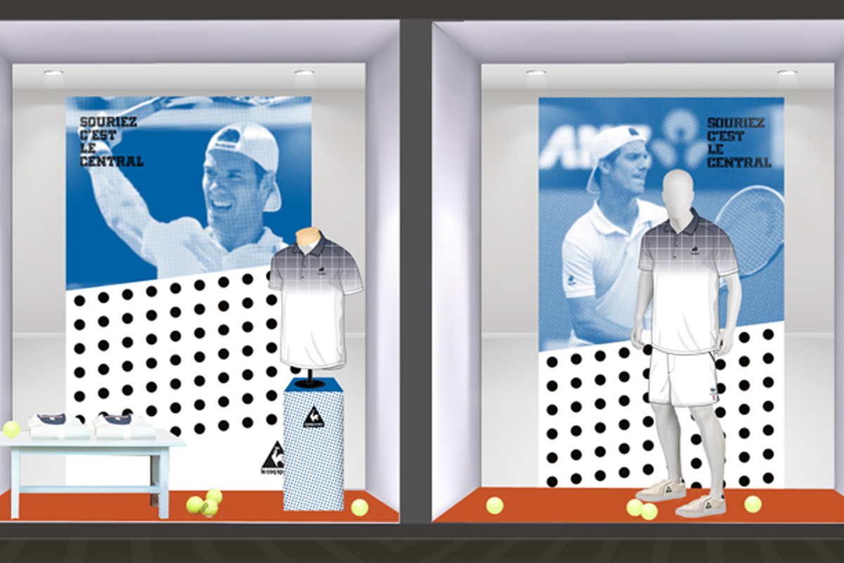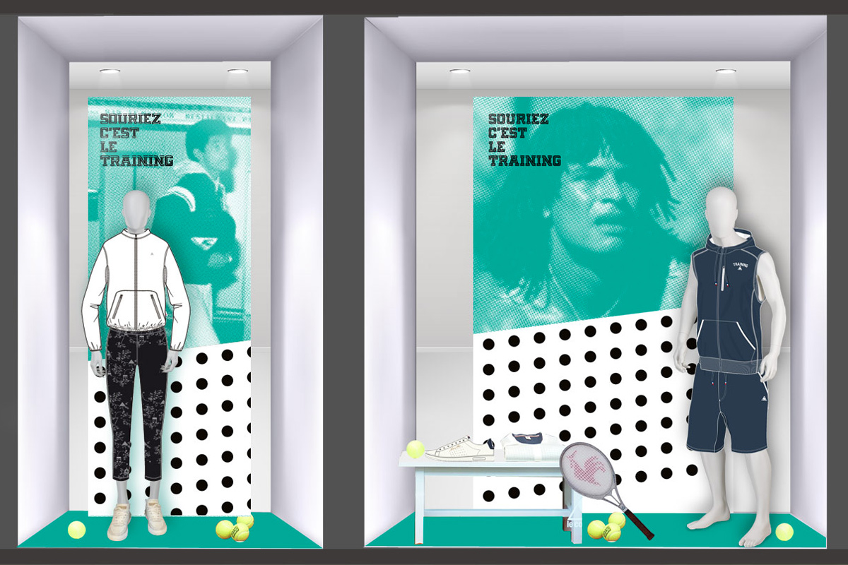 Création d'un concept de communication in store pour fédérer l’ensemble des collections tennis de la marque en mêlant les époques et les ambassadeurs de la marque :